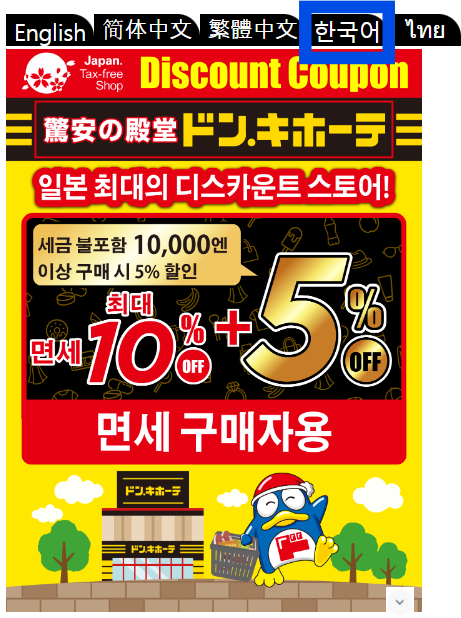 돈키호테 할인 쿠폰은 10,000엔 이상 구매 후 계산할 때 점원에게 '돈키호테 할인 쿠폰 받기' 링크 화면에 뜨는 화면을 보여주면 됩니다. 이때 면세 할인을 받으려면 여권이 필요하니 반드시 지참하시기 바랍니다.